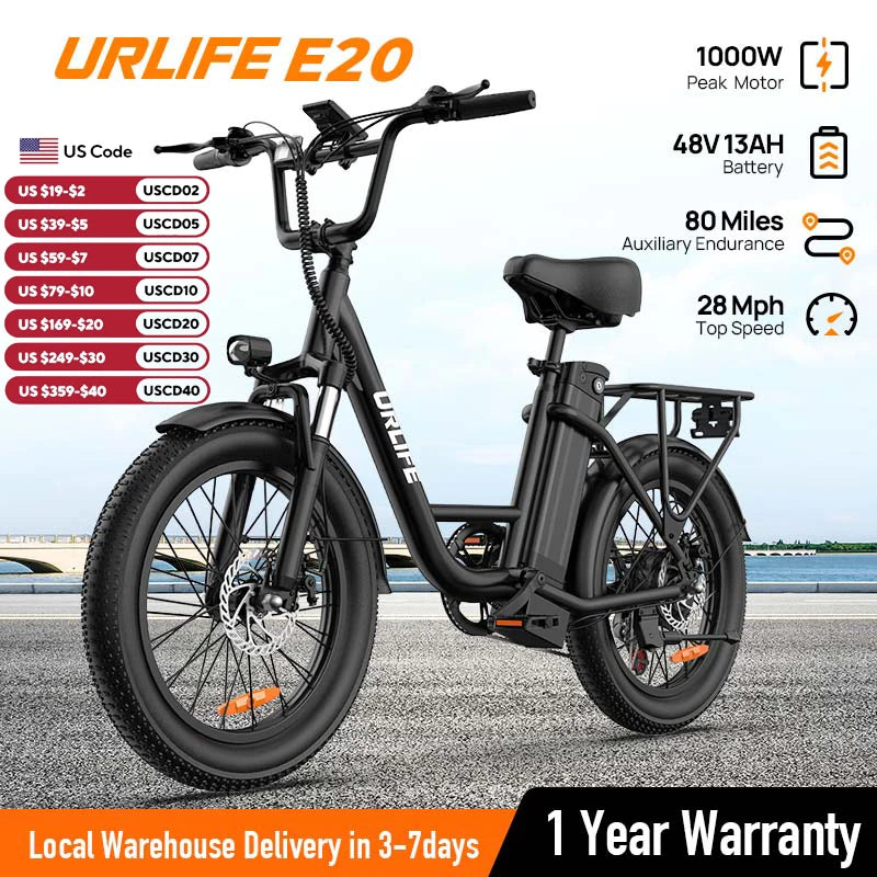 1000W E20 Electric Bike | 48V 13Ah Removable Battery, 20MPH, 20''X3" Fat Tire, 7-Speed Electric Bicycles with Dual Disc Brake