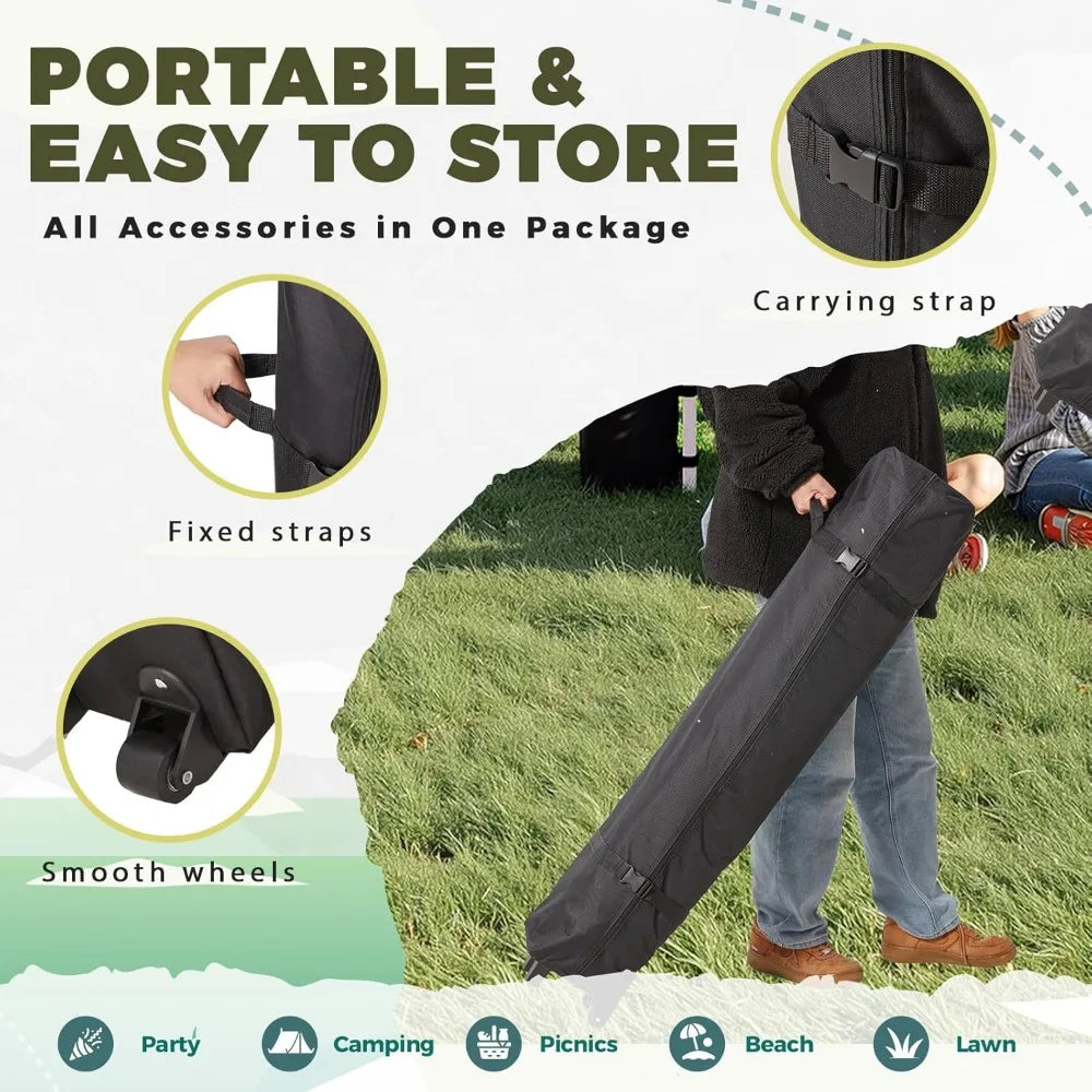 - 【EASY TO TRANSPORT】 This outdoor tent comes with a 600D Oxford cloth wheeled bag that makes storage and transport a breeze. You can take your canopy tent with you to any outdoor event location. The compact storage size fits most vehicles, and one person can lift/roll the wheeled bag easily