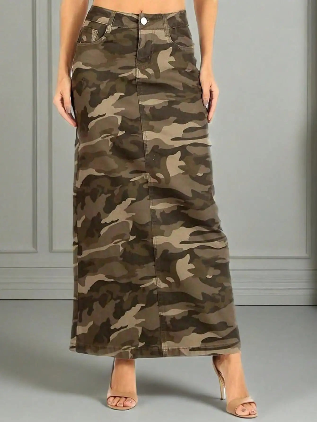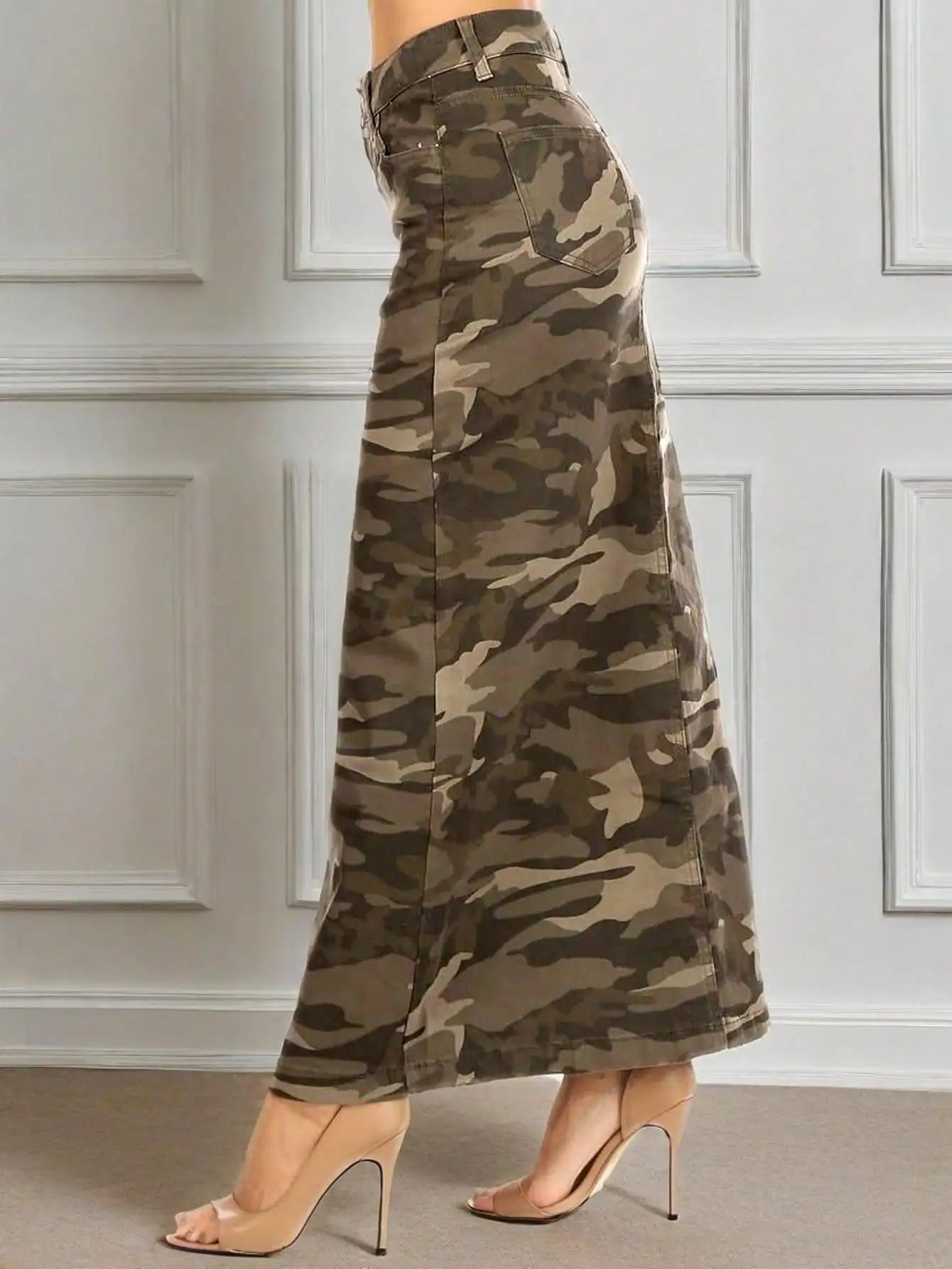 Women's long and elegant camouflage denim skirt with button/zipper closure and functional side pockets - a must-have item for women's streetwear, casual wear, daily wear, and wardrobe