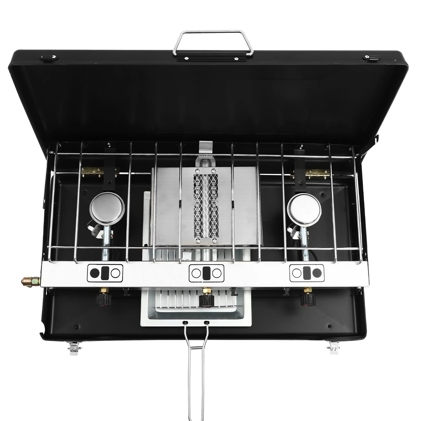 With 3 burners and 1.5kw high power of each burner, the product can provide fast and even heating for three cooking positions at the same time. Each of the three burners comes with a knob, allowing you to easily adjust the heat level for different uses. The lid works as a windscreen for heat distribution and protection. Thanks to its foldable design, lightweight(less than 9.92 lbs), and sturdy handle, you can easily carry it for a camping activity. Without installation and assembly requirements, you just need to connect the fuel(not included) to it and then you can start to use it. The product is ideal for camping, barbecues, parties, picnics, or outdoor hiking.