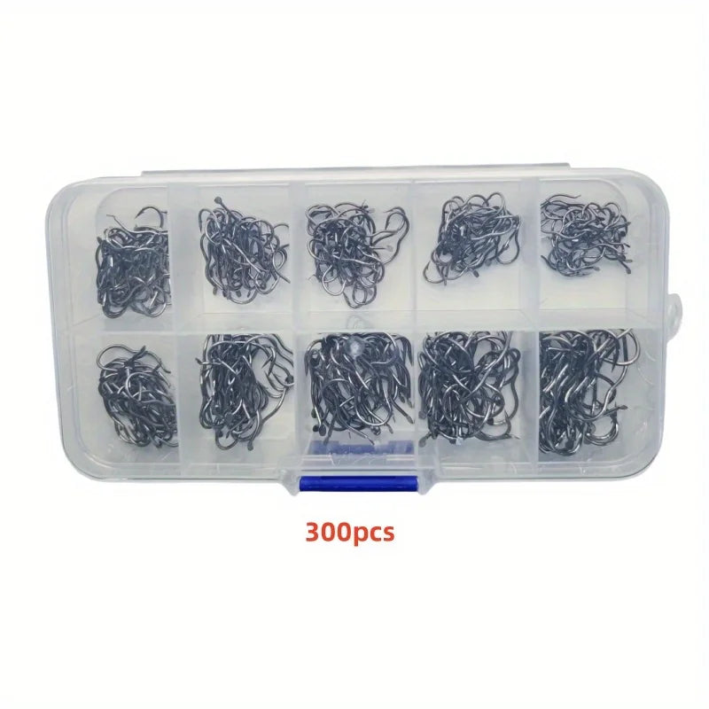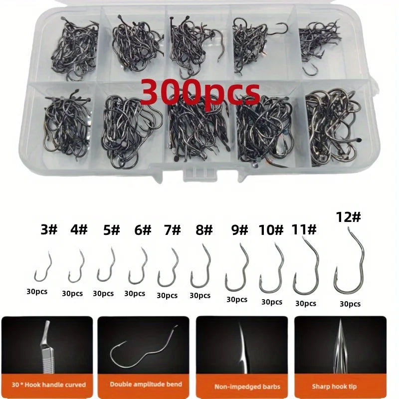 300/500 carbon steel fishing hook set, including sizes 3-12, with barbed sharp hooks