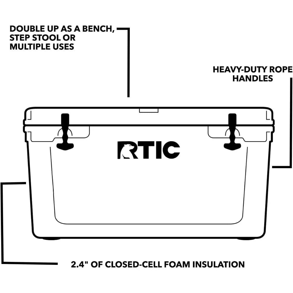 - MANY SIZES AVAILABLE – This outdoor cooler comes in 20 qt, 45 qt, 65 qt, 110 qt, and 145 qt sizes. This hard cooler can double up as a bench, step stool or tabletop. Capacity: 65 QT / Up to 84 cans. Measures: 17'' x 31 5/8'' x 17 2/3''; Weight: 37.7.