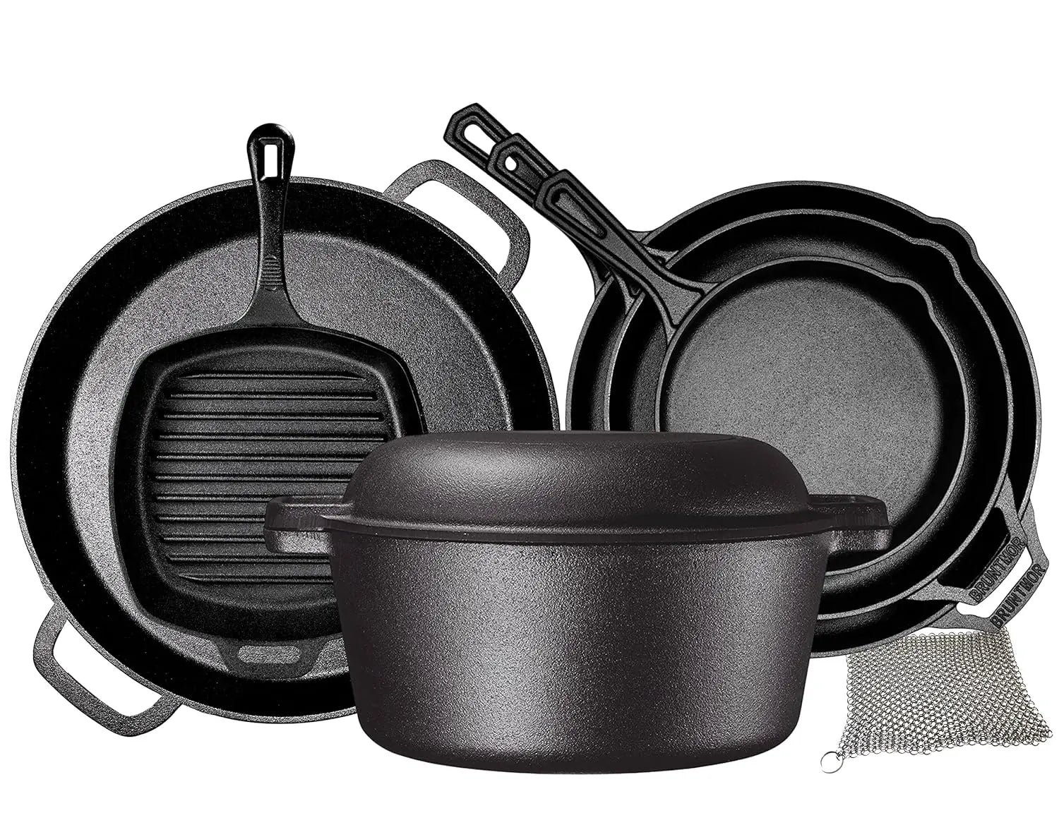 - Complete 8-Piece Set: Includes 3 cast iron skillets, square grill pan, double Dutch oven, 16-inch pizza pan, and chainmail scrubber; versatile pots and pans set to meet all your kitchen cooking needs