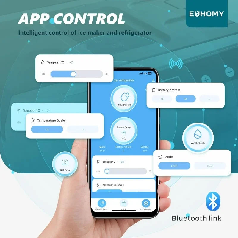 Large Capacity & APP Control; The unique 35QT car fridge and 13QT ice maker design holds 32 cans, 26 bottles of water, or 9 wine bottles. You can easily control the electric coolers and ice maker settings via Bluetooth with the APP, allowing you to adjust temperature and ice speed effortlessly