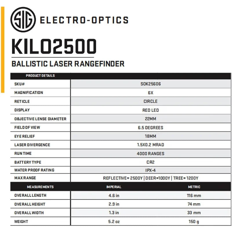 - NHANCED PRECISION - The KILO2500 6X22 Ballistic Laser Rangefinder by SIG SAUER ensures unparalleled accuracy with its advanced features; Boasting SpectraCoat anti-reflection coatings, this rangefinder guarantees superior light transmission and clarity in all lighting conditions, providing hunters and shooters with a clear view of their target