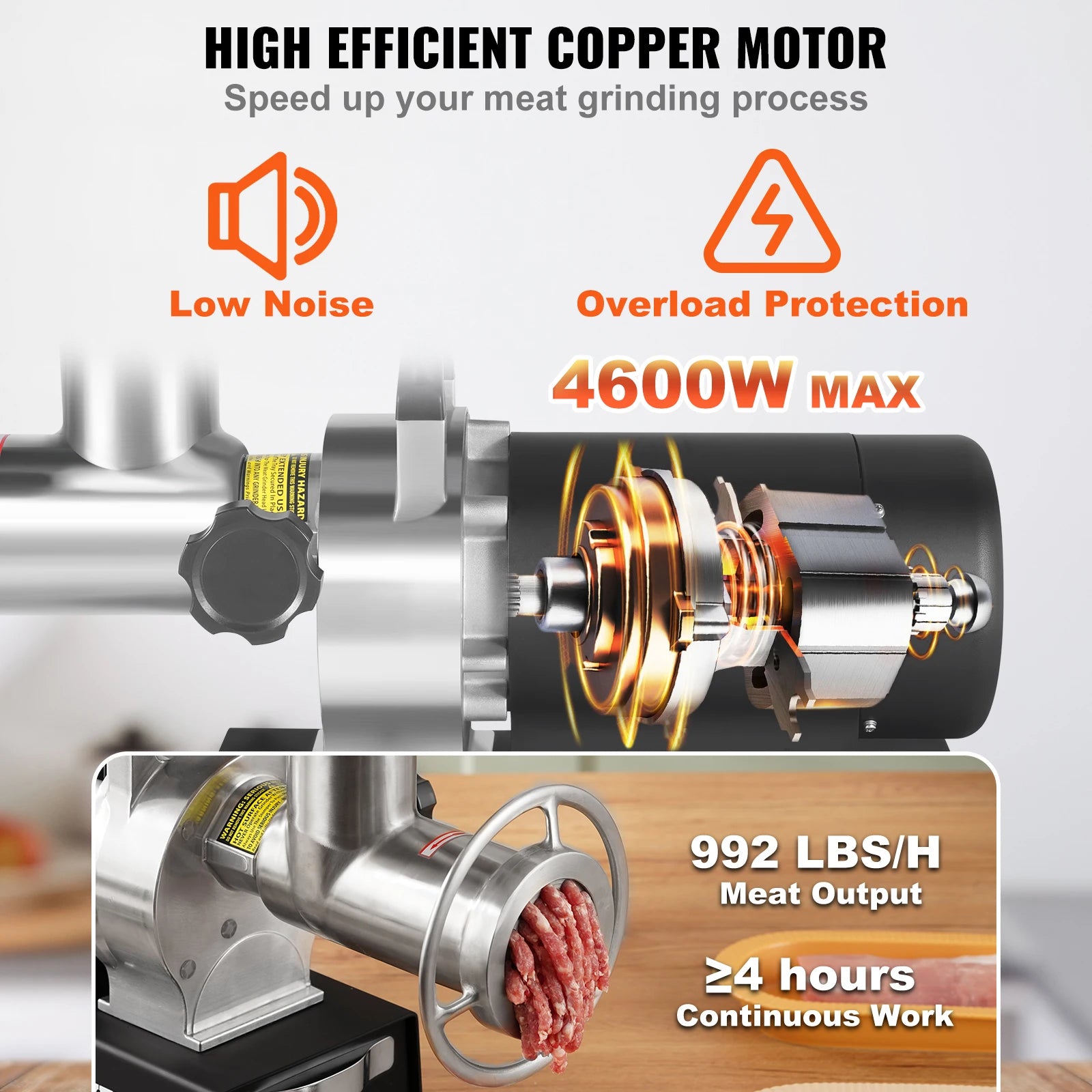4600W Max Meat Grinder: The meat grinder mechanical is using the 100% pure copper motor normal rated up to 1100W (4600W max) and an oversized meat hopper measuring 15.8" x 10.3" x 3.2" that can hold approximately 26.5-33 pounds of prepared meat for grinding. This grinder can grind up to 992 pounds of meat per hour and operate continuously for more than 4 hours.