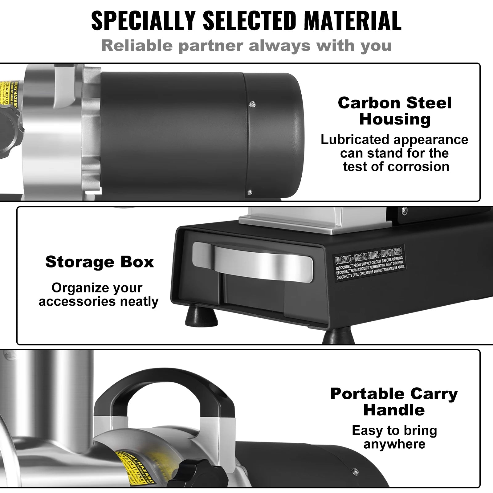 Well Built & ETL Certified: As a heavy-duty commercial meat grinder, it is ETL certified. With carbon steel construction, the part in contact with food is made of 100% food-grade material; the storage box helps you to avoid the loss of accessories, in addition, the handle on the top of the machine makes it easy to take it anywhere you want to use.