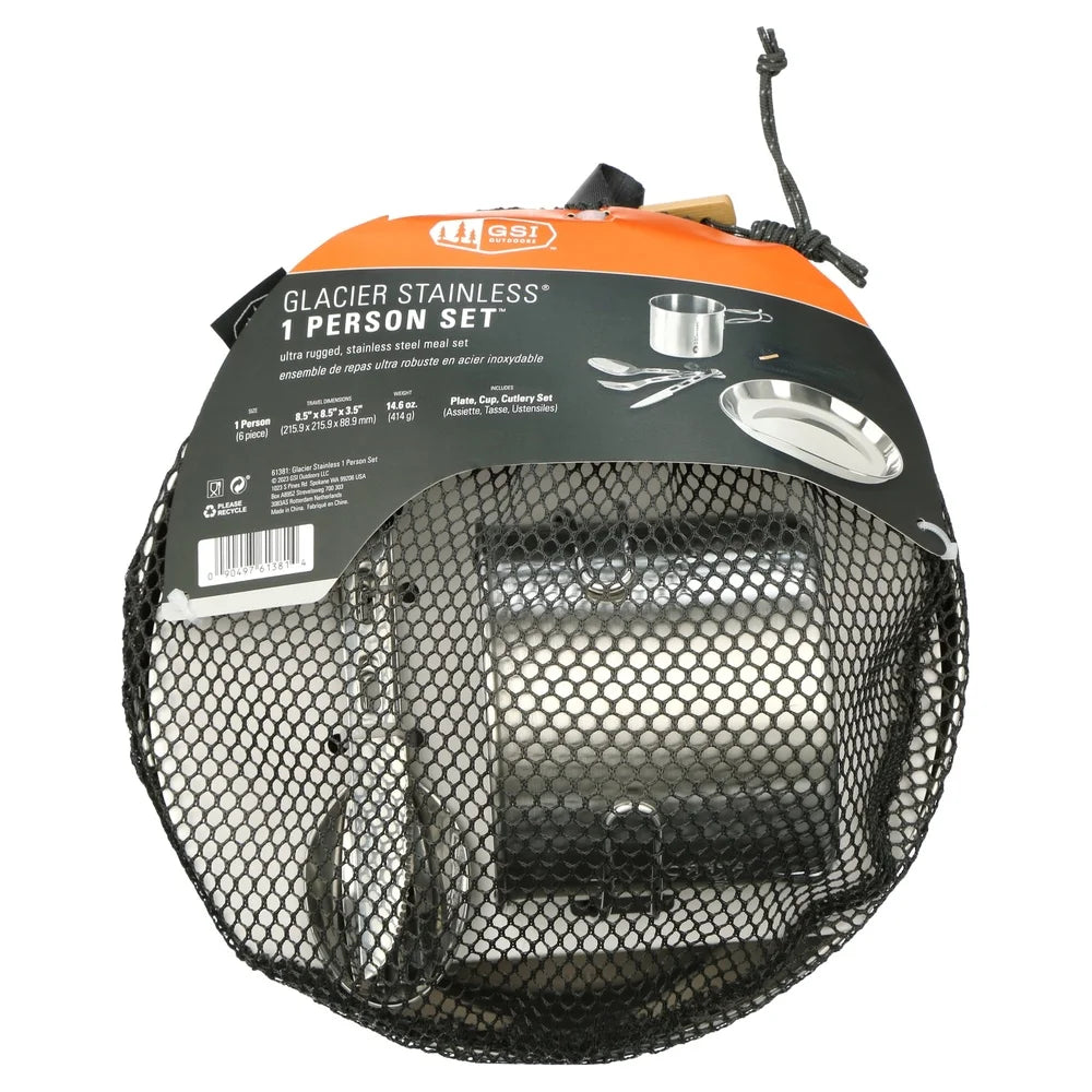Ultra-clean, lightweight yet rugged, this set will serve many in-camp purposes for several years to come. The deep plate allows food to stay securely on the plate. The 20 fl. oz. Glacier Stainless Bottle Cup/Pot is designed to fit around most round 1 liter water bottles, eliminating the wasted space of packing a more traditional cup. The Glacier Stainless 3 pc. Cutlery Set's forged stainless steel construction offers a bombproof set of utensils that is light enough to pack yet still strong enough to face any adventure, high or low.