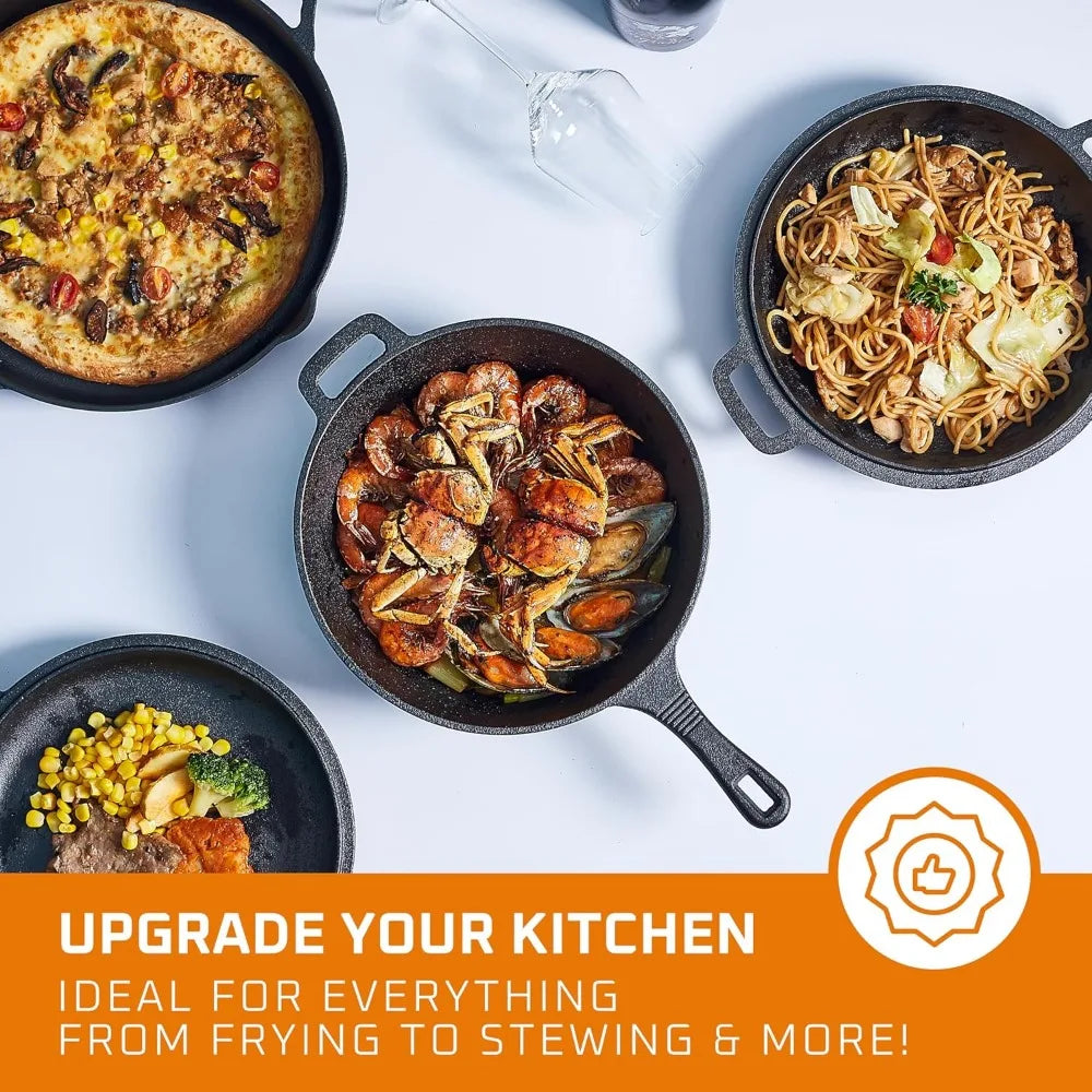 - PRE-SEASONED AND READY-TO-USE PAN SET : These pans are pre-seasoned and suitable for all cooktops, including induction, with a secure usage range of up to 500 degrees Fahrenheit.