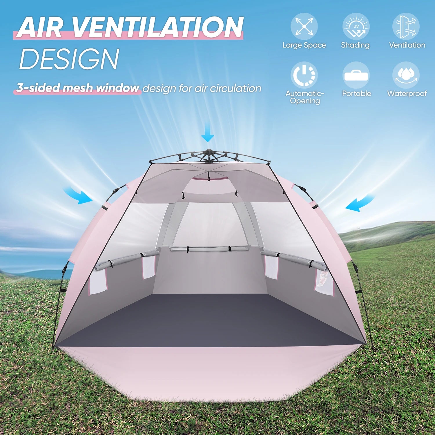 ☀️360° Ventilation Beach Tent: Equipped with 3 large mesh windows, the portable sun shelter ensures excellent airflow and ventilation from every angle.